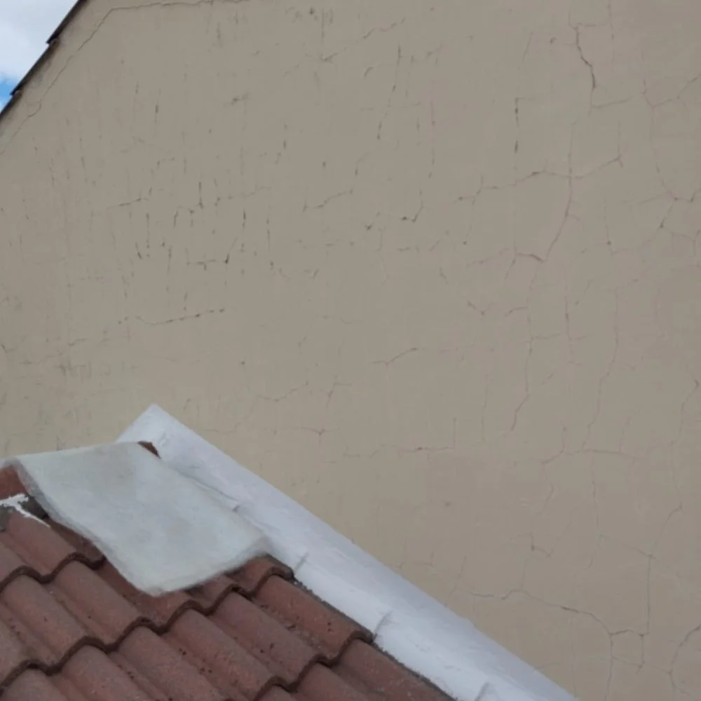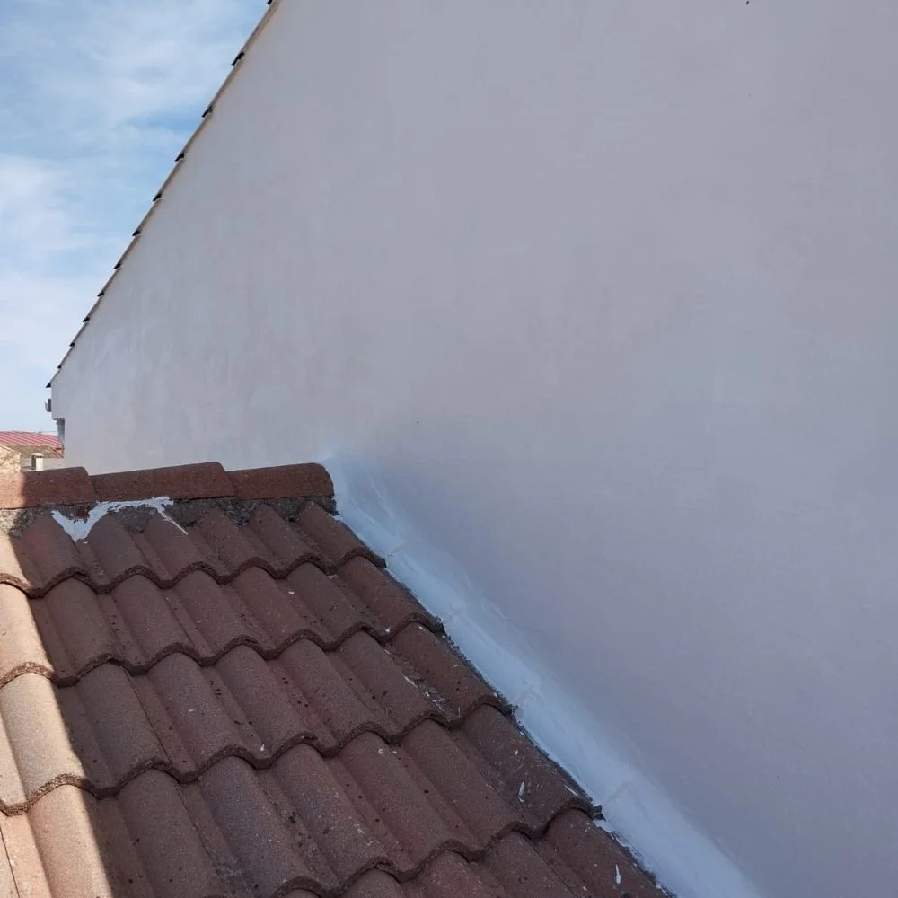 Impermeabilización de fachada en Villabilla, con sellador blanco aplicado en la unión entre la pared y el tejado de terracota
